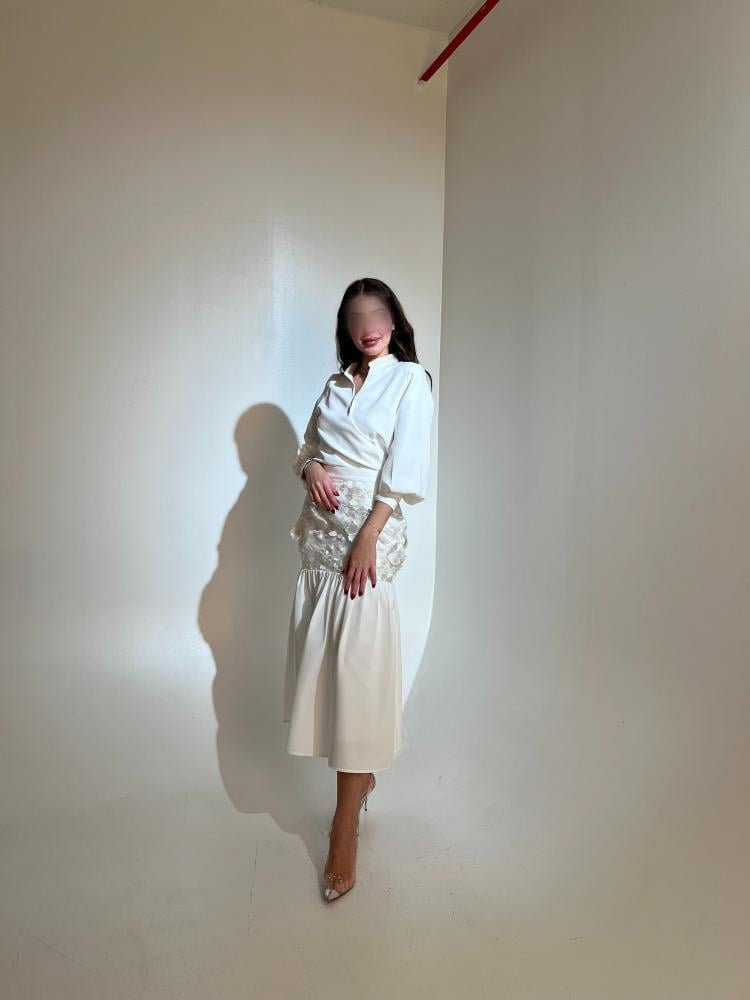 - تنورة بيضاء واسعة مزينة بتفاصيل بارزة على شكل أزهار في الجزء العلوي، مما يضيف لمسة أنثوية ساحرة إلى الطقم، وتنسدل بشكل واسع نحو الأسفل لتعطي مظهرًا أنيقًا وانسيابيًا.