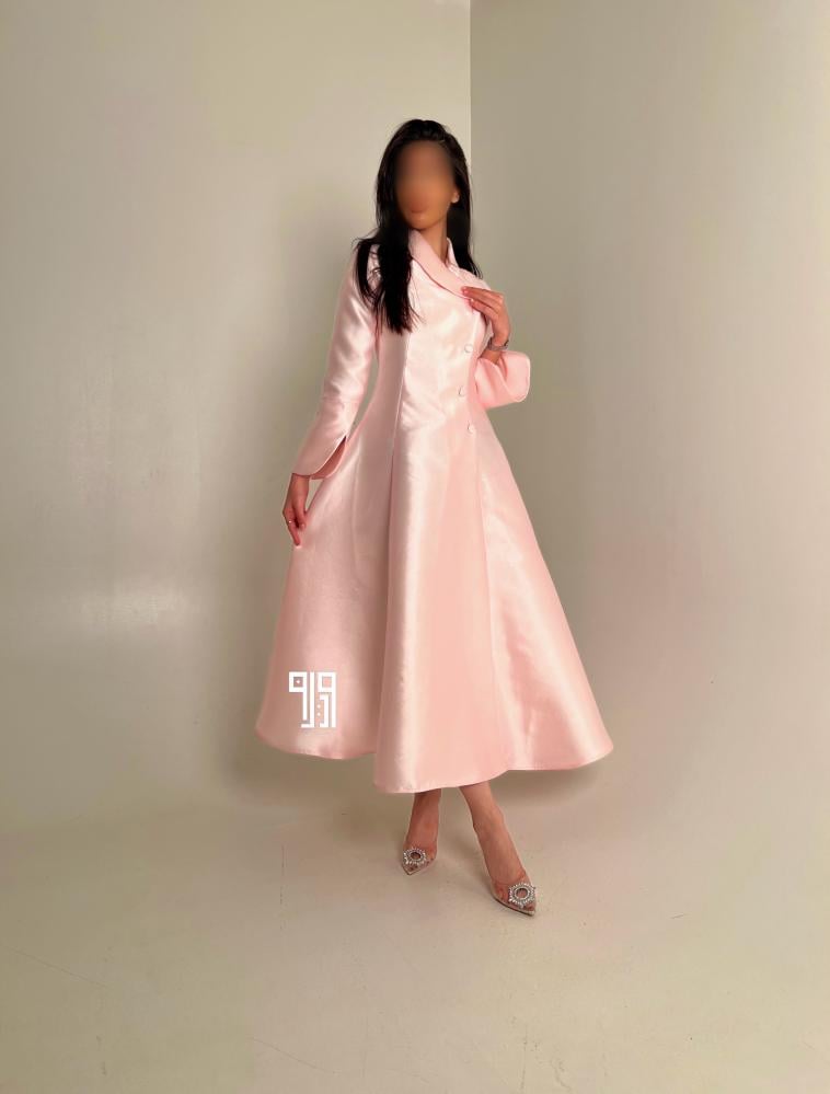 فستان وردي أنيق من قماش التفته الفاخر المعروف بلمعانه الناعم ولمسته الحريرية.